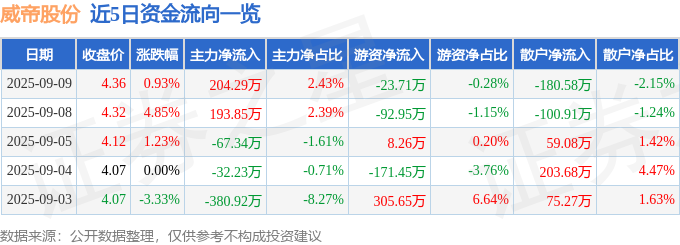 证券之星消息,截至2025年9月9日收盘,威帝股份(603023)报收于4.36元,上涨0.93%,换手率3.42%,成交量19.1万手,成交额8413.93万元。