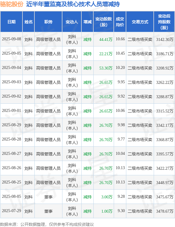 骆驼股份近半年内的董监高及核心技术人员增减持详情如下: