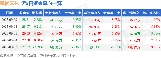 证券之星消息,截至2025年9月9日收盘,锋尚文化(300860)报收于28.31元,下跌2.28%,换手率2.53%,成交量2.83万手,成交额8037.58万元。