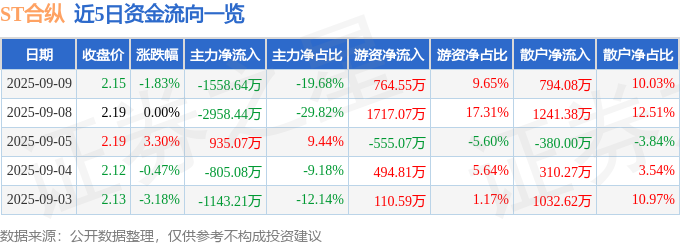 证券之星消息,截至2025年9月9日收盘,ST合纵(300477)报收于2.15元,下跌1.83%,换手率3.7%,成交量36.61万手,成交额7920.19万元。