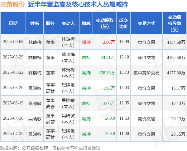 证券之星消息,根据9月9日市场公开信息、上市公司公告及交易所披露数据整理,光莆股份(300632)最新董监高及相关人员股份变动情况:2025年9月8日公司董事林瑞梅共增持公司股份2.0万股,占公司总股本为0.0066%。变动期间公司股价上涨1.54%,9月8日当日收盘报13.16元。