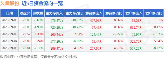 证券之星消息,截至2025年9月9日收盘,久量股份(300808)报收于28.8元,下跌0.69%,换手率1.34%,成交量1.6万手,成交额4594.97万元。