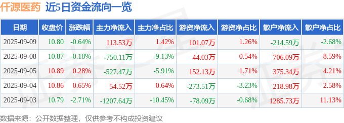 证券之星消息,截至2025年9月9日收盘,仟源医药(300254)报收于10.8元,下跌0.64%,换手率3.25%,成交量7.38万手,成交额8016.41万元。