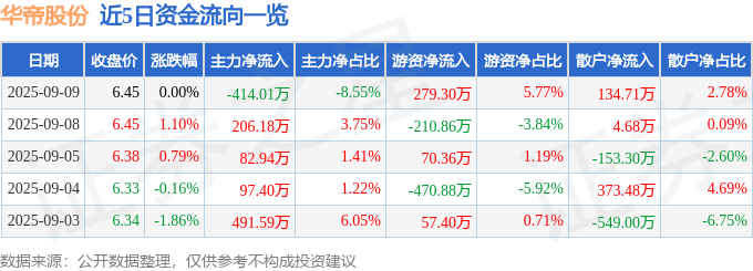 9月9日的资金流向数据方面,主力资金净流出414.01万元,占总成交额8.55%,游资资金净流入279.3万元,占总成交额5.77%,散户资金净流入134.71万元,占总成交额2.78%。