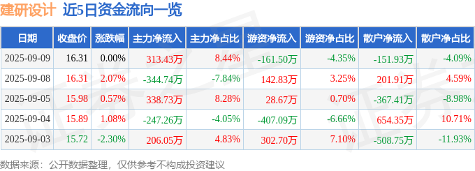 证券之星消息,截至2025年9月9日收盘,建研设计(301167)报收于16.31元,上涨0.0%,换手率3.2%,成交量2.28万手,成交额3713.02万元。