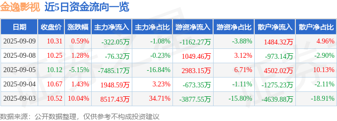 证券之星消息,截至2025年9月9日收盘,金逸影视(002905)报收于10.31元,上涨0.59%,换手率8.25%,成交量28.83万手,成交额2.99亿元。