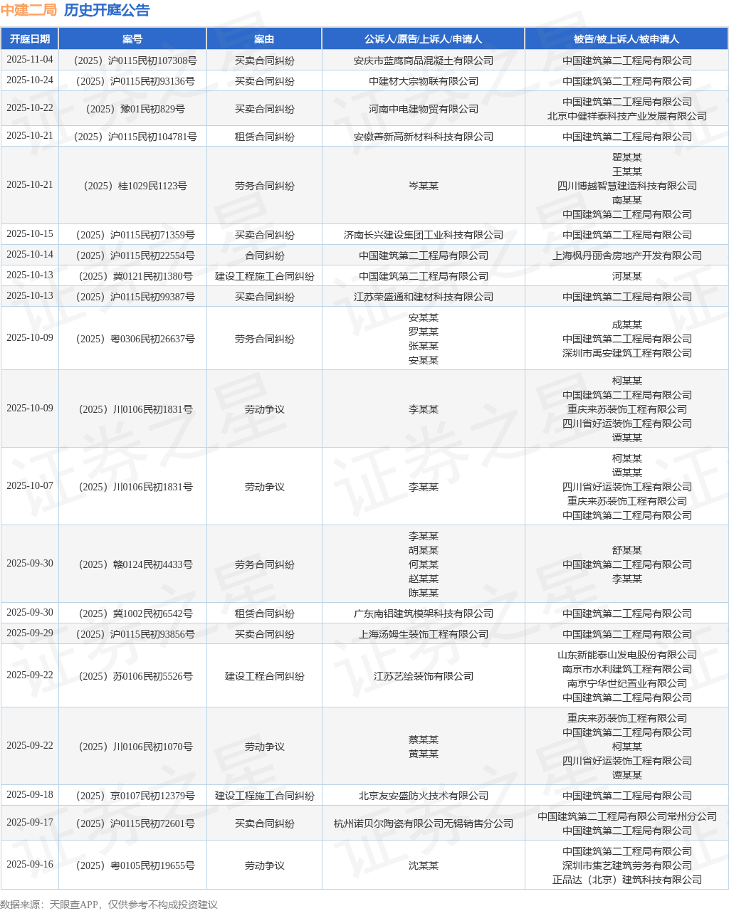 案号:(2025)苏0105民初5342号根据统计,近一年内以中国建筑第二工程局有限公司为当事人的历史开庭公告有2118则,其中案由为“买卖合同纠纷”的公告以619则居首,其次为“劳务合同纠纷”有288则,“建设工程施工合同纠纷”有260则。历史开庭公告(前20条)如下: