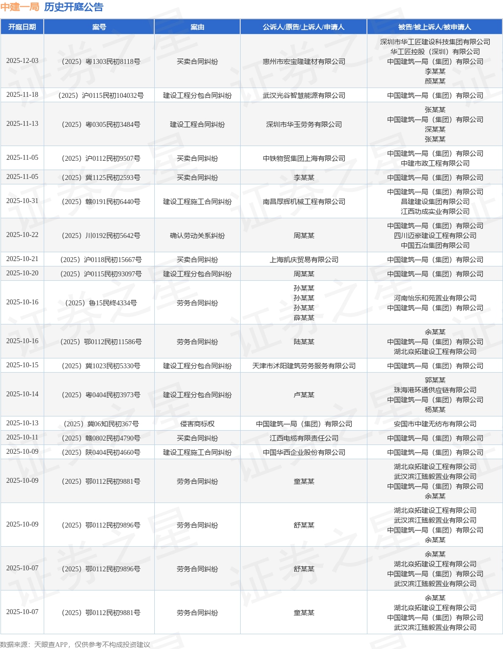 案号:(2025)苏01民终10633号根据统计,近一年内以中国建筑一局(集团)有限公司为当事人的历史开庭公告有1422则,其中案由为“建设工程施工合同纠纷”的公告以392则居首,其次为“买卖合同纠纷”有195则,“建设工程分包合同纠纷”有186则。历史开庭公告(前20条)如下: