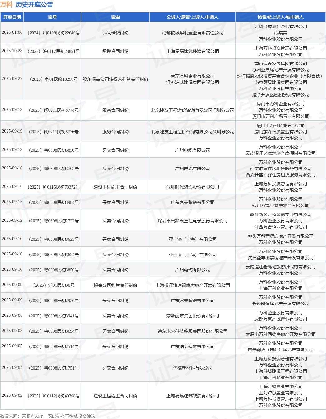案号:(2025)粤0308民初2722号根据统计,近一年内以万科企业股份有限公司为当事人的历史开庭公告有355则,其中案由为“买卖合同纠纷”的公告以215则居首,其次为“建设工程施工合同纠纷”有28则,“服务合同纠纷”有16则。历史开庭公告(前20条)如下:
