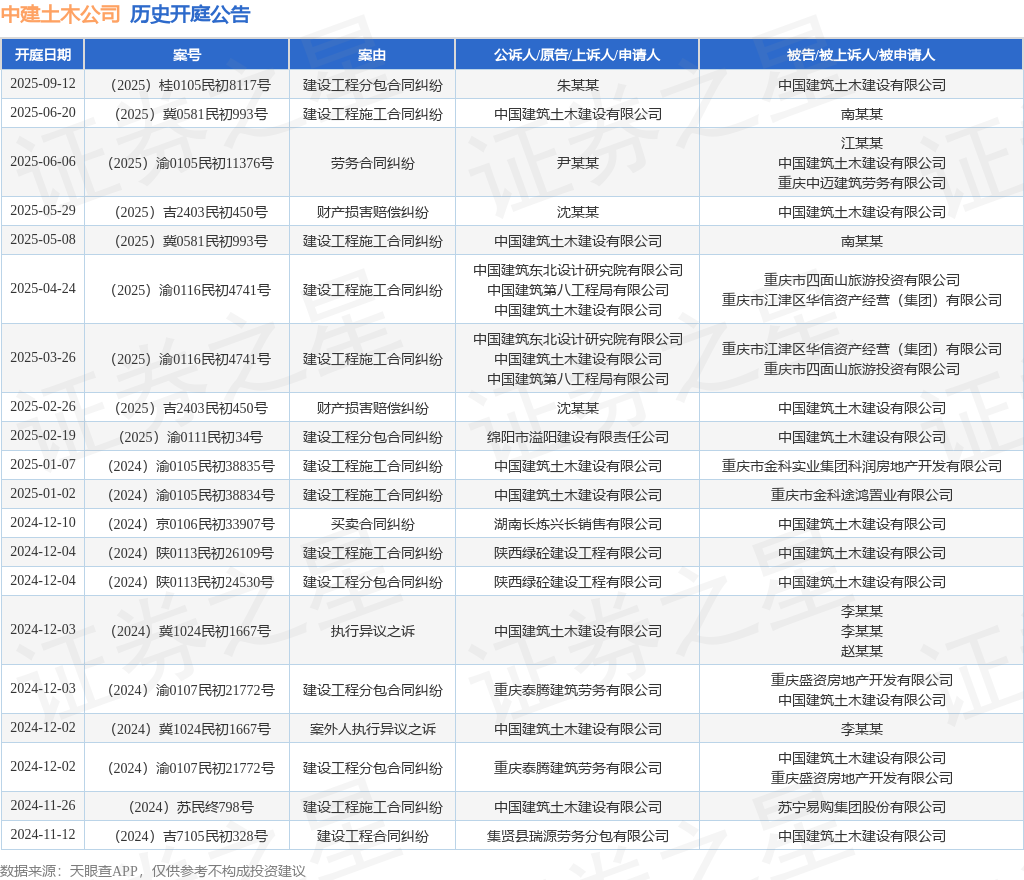 案号:(2025)桂0105民初8117号根据统计,近一年内以中国建筑土木建设有限公司为当事人的历史开庭公告有27则,其中案由为“建设工程施工合同纠纷”的公告以9则居首,其次为“建设工程分包合同纠纷”有6则,“建设工程合同纠纷”有4则。历史开庭公告(前20条)如下: