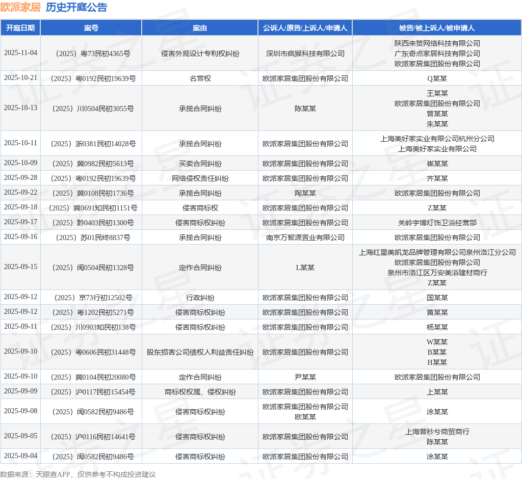 案号:(2025)粤1202民初5271号根据统计,近一年内以欧派家居集团股份有限公司为当事人的历史开庭公告有312则,其中案由为“侵害商标权纠纷”的公告以67则居首,其次为“买卖合同纠纷”有57则,“承揽合同纠纷”有57则。历史开庭公告(前20条)如下: