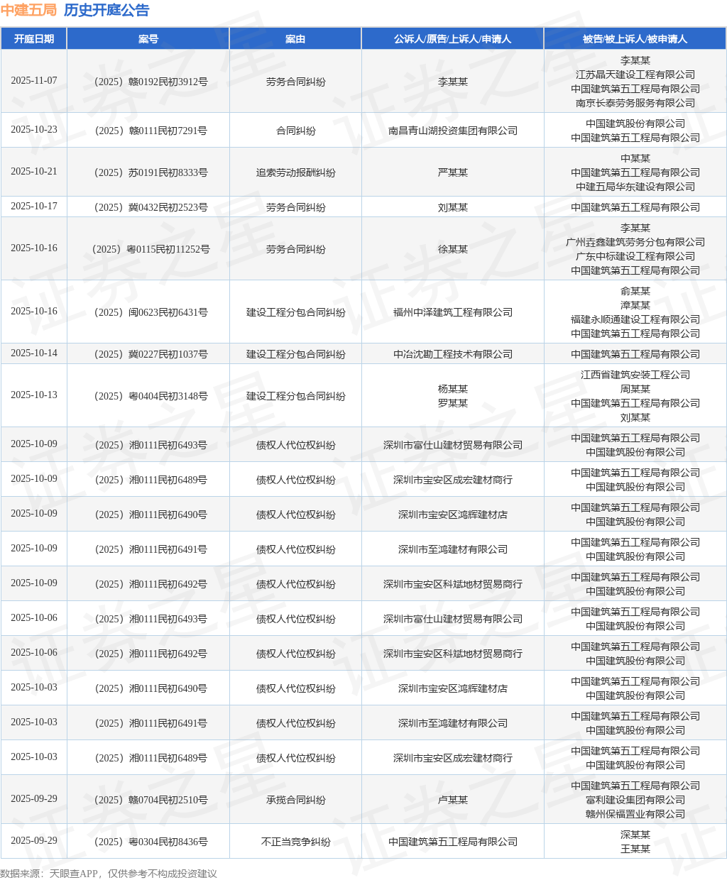 案号:(2025)粤1303民初3772号根据统计,近一年内以中国建筑第五工程局有限公司为当事人的历史开庭公告有934则,其中案由为“买卖合同纠纷”的公告以196则居首,其次为“建设工程施工合同纠纷”有135则,“劳务合同纠纷”有127则。历史开庭公告(前20条)如下: