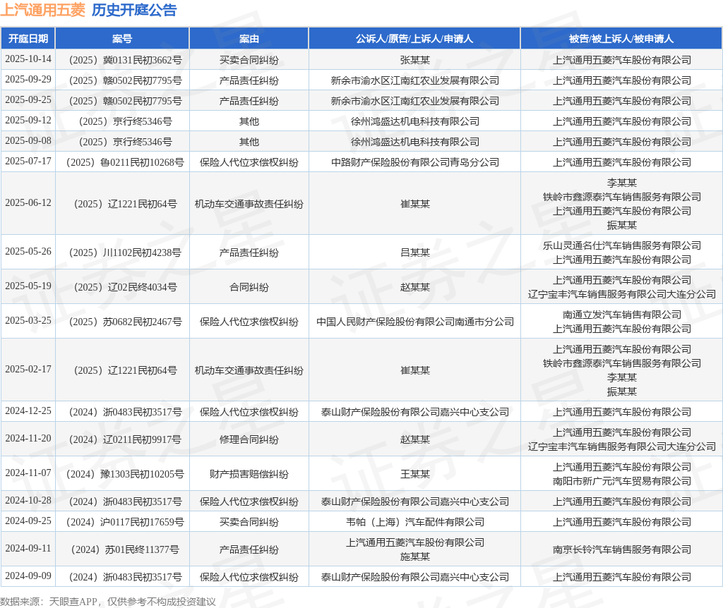 案号:(2025)京行终5346号根据统计,近一年内以上汽通用五菱汽车股份有限公司为当事人的历史开庭公告有18则,其中案由为“保险人代位求偿权纠纷”的公告以5则居首,其次为“产品责任纠纷”有4则,“买卖合同纠纷”有2则。历史开庭公告如下: