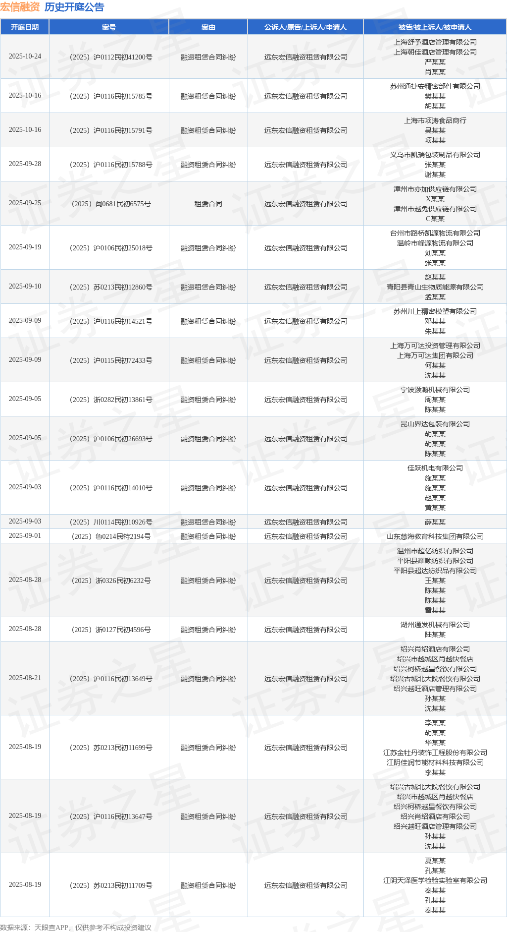 根据统计,近一年内以远东宏信融资租赁有限公司为当事人的历史开庭公告有81则,其中案由为“融资租赁合同纠纷”的公告以79则居首,其次为“租赁合同”有2则。历史开庭公告(前20条)如下: