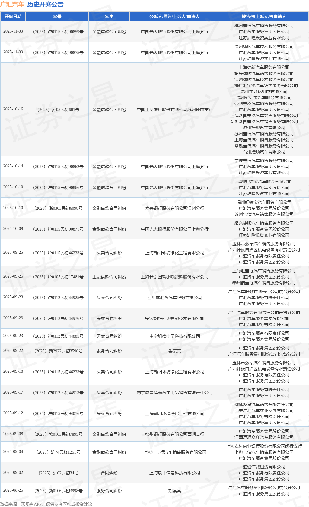 案号:(2025)沪0115民初94076号根据统计,近一年内以广汇汽车服务集团股份公司为当事人的历史开庭公告有87则,其中案由为“买卖合同纠纷”的公告以33则居首,其次为“金融借款合同纠纷”有30则,“证券虚假陈述责任纠纷”有11则。历史开庭公告(前20条)如下:
