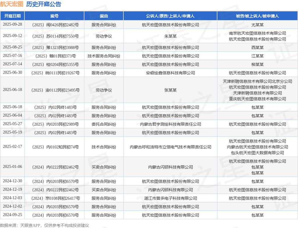 案号:(2025)苏0114民初7550号根据统计,近一年内以航天宏图信息技术股份有限公司为当事人的历史开庭公告有18则,其中案由为“服务合同纠纷”的公告以11则居首,其次为“买卖合同纠纷”有2则,“劳动争议”有2则。历史开庭公告如下: