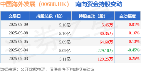证券之星消息,9月9日南向资金增持5.45万股中国海外发展(00688.HK)。近5个交易日中,获南向资金增持的有4天,累计净增持50.55万股。近20个交易日中,获南向资金减持的有10天,累计净减持408.43万股。截至目前,南向资金持有中国海外发展(00688.HK)5.1亿股,占公司已发行普通股的4.65%。