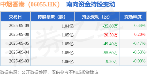证券之星消息,9月9日南向资金减持35.8万股中烟香港(06055.HK)。近5个交易日中,获南向资金减持的有4天,累计净减持129.5万股。近20个交易日中,获南向资金减持的有13天,累计净减持983.84万股。截至目前,南向资金持有中烟香港(06055.HK)1.04亿股,占公司已发行普通股的15.08%。