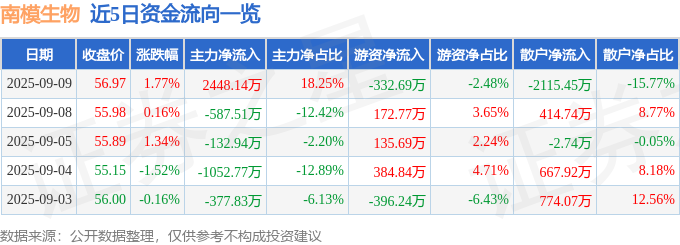 证券之星消息,截至2025年9月9日收盘,南模生物(688265)报收于56.97元,上涨1.77%,换手率2.96%,成交量2.31万手,成交额1.34亿元。