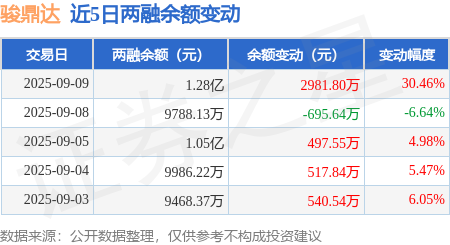 证券之星消息,9月9日,骏鼎达(301538)融资买入6075.63万元,融资偿还3093.83万元,融资净买入2981.8万元,融资余额1.28亿元。