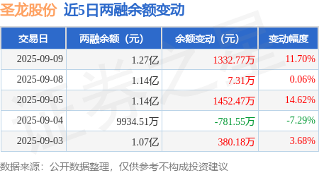证券之星消息,9月9日,圣龙股份(603178)融资买入3996.46万元,融资偿还2663.69万元,融资净买入1332.77万元,融资余额1.27亿元,近3个交易日已连续净买入累计2792.55万元,近20个交易日中有11个交易日出现融资净买入。