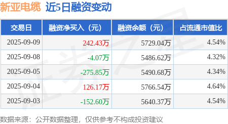 证券之星消息,9月9日,新亚电缆(001382)融资买入569.53万元,融资偿还327.11万元,融资净买入242.43万元,融资余额5729.04万元。