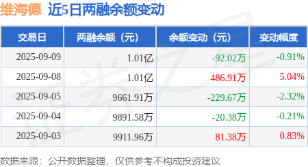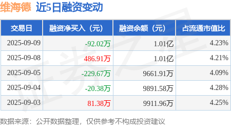 证券之星消息,9月9日,维海德(301318)融资买入502.59万元,融资偿还594.61万元,融资净卖出92.02万元,融资余额1.01亿元。