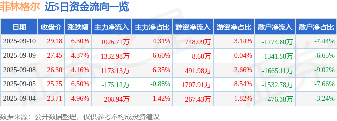 证券之星消息,截至2025年9月10日收盘,菲林格尔(603226)报收于29.18元,上涨6.3%,换手率2.37%,成交量8.41万手,成交额2.38亿元。