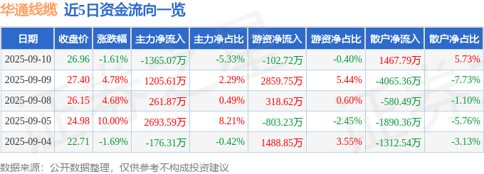 证券之星消息,截至2025年9月10日收盘,华通线缆(605196)报收于26.96元,下跌1.61%,换手率1.88%,成交量9.47万手,成交额2.56亿元。