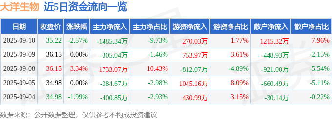 证券之星消息,截至2025年9月10日收盘,大洋生物(003017)报收于35.22元,下跌2.57%,换手率6.19%,成交量4.29万手,成交额1.53亿元。