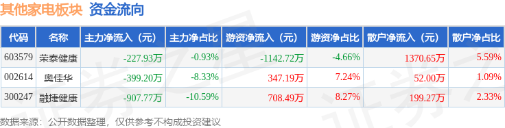 从资金流向上来看,当日其他家电板块主力资金净流出1534.89万元,游资资金净流出87.03万元,散户资金净流入1621.92万元。其他家电板块个股资金流向见下表: