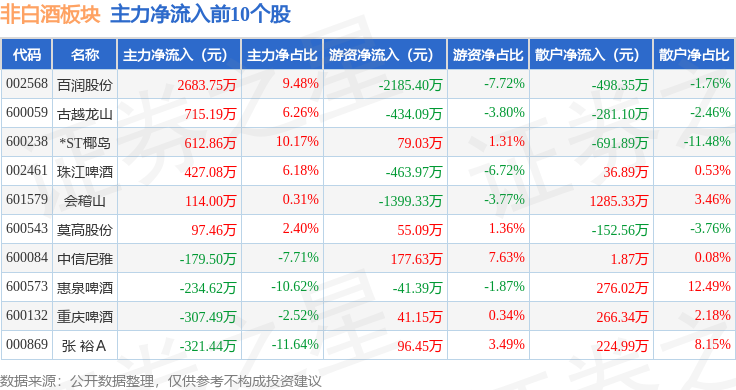 从资金流向上来看,当日非白酒板块主力资金净流出888.95万元,游资资金净流出1923.32万元,散户资金净流入2812.27万元。非白酒板块个股资金流向见下表: