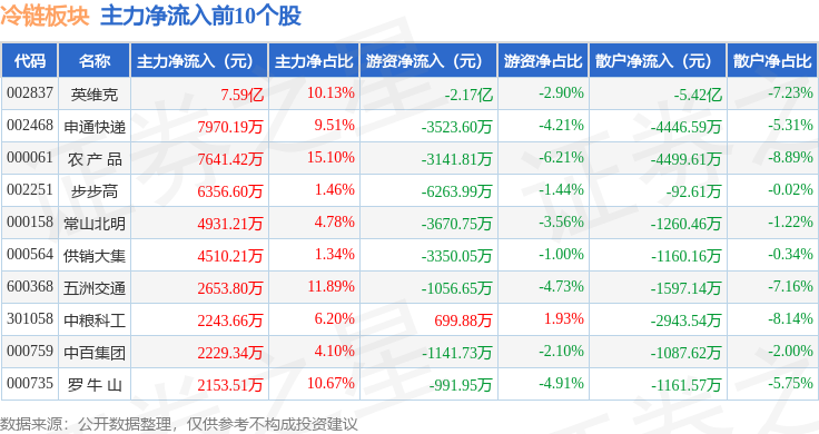 从资金流向上来看,当日冷链板块主力资金净流入5.09亿元,游资资金净流出4.48亿元,散户资金净流出6038.54万元。冷链板块个股资金流向见下表: