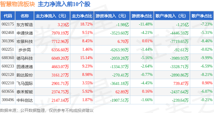 从资金流向上来看,当日智慧物流板块主力资金净流出6541.48万元,游资资金净流出3.08亿元,散户资金净流入3.73亿元。智慧物流板块个股资金流向见下表: