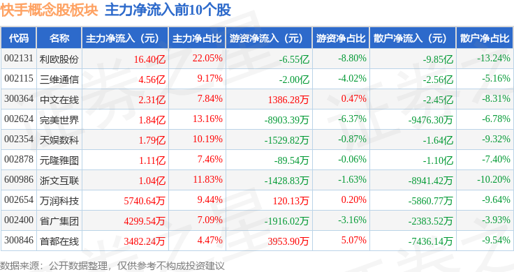 从资金流向上来看,当日快手概念股板块主力资金净流入28.46亿元,游资资金净流出8.89亿元,散户资金净流出19.56亿元。快手概念股板块个股资金流向见下表: