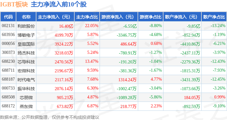 从资金流向上来看,当日IGBT板块主力资金净流入4.29亿元,游资资金净流出1.59亿元,散户资金净流出2.7亿元。IGBT板块个股资金流向见下表: