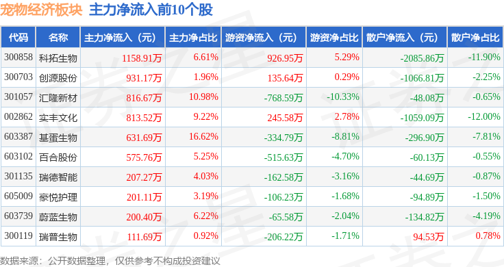 从资金流向上来看,当日宠物经济板块主力资金净流出3.84亿元,游资资金净流入5480.84万元,散户资金净流入3.29亿元。宠物经济板块个股资金流向见下表: