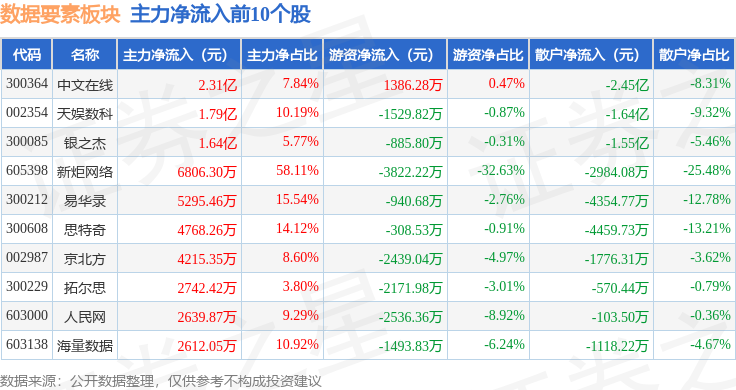 从资金流向上来看,当日数据要素板块主力资金净流出6372.75万元,游资资金净流入2.88亿元,散户资金净流出2.24亿元。数据要素板块个股资金流向见下表: