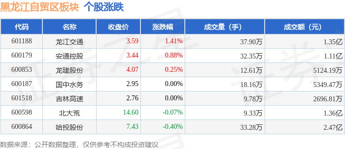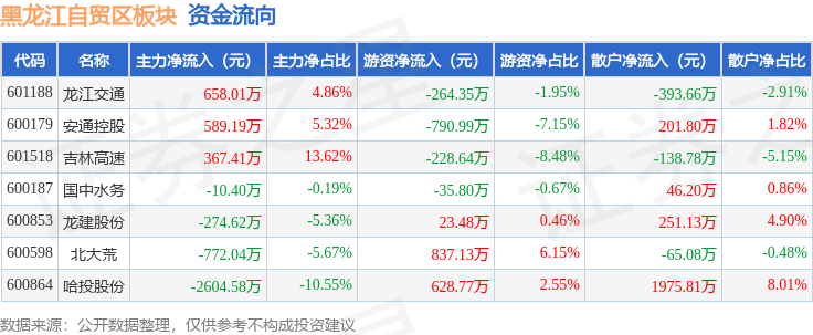 从资金流向上来看,当日黑龙江自贸区板块主力资金净流出2047.03万元,游资资金净流入169.61万元,散户资金净流入1877.42万元。黑龙江自贸区板块个股资金流向见下表: