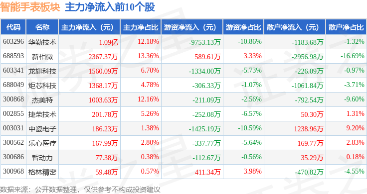 从资金流向上来看,当日智能手表板块主力资金净流出10.08亿元,游资资金净流入1.04亿元,散户资金净流入9.04亿元。智能手表板块个股资金流向见下表: