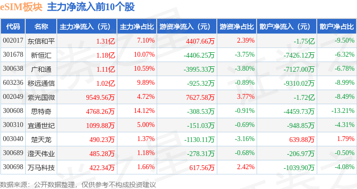 从资金流向上来看,当日eSIM板块主力资金净流入4.35亿元,游资资金净流入2768.12万元,散户资金净流出4.63亿元。eSIM板块个股资金流向见下表: