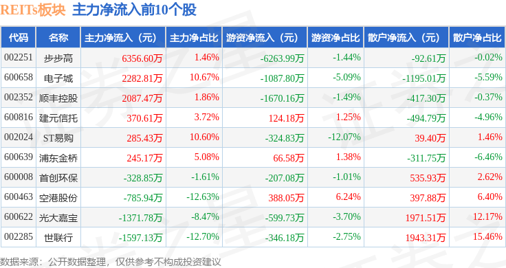 从资金流向上来看,当日REITs板块主力资金净流出1.55亿元,游资资金净流出1.12亿元,散户资金净流入2.67亿元。REITs板块个股资金流向见下表: