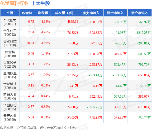 个股表现方面,化学原料行业当日领涨股为*ST亚太(000691),该股当日报收6.75,上涨4.98%,成交量4890.0,主力资金净流入150.91万元。金牛化工(600722)以上涨4.26%紧随其后,该股当日成交量76.82万,主力资金净流入1308.33万元。除此之外,善水科技(301190)、新金路(000510)、兴化股份(002109)均进入当日牛股之列。具体个股列表见下表: