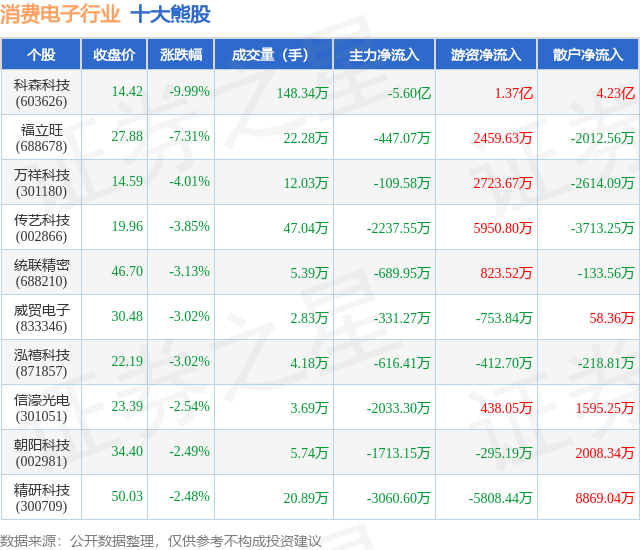 个股表现方面,消费电子行业当日领跌股为科森科技(603626),该股当日报收14.42,下跌9.99%,成交量148.34万,主力资金净流出5.6亿元。福立旺(688678)以下跌7.31%紧随其后,该股当日成交量22.28万,主力资金净流出447.07万元。除此之外,万祥科技(301180)、传艺科技(002866)、统联精密(688210)均进入当日熊股之列。具体个股列表见下表: