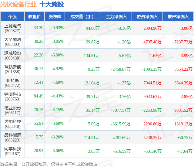个股表现方面,光伏设备行业当日领跌股为上能电气(300827),该股当日报收33.3,下跌9.93%,成交量94.0万,主力资金净流出3.3亿元。大全能源(688303)以下跌8.05%紧随其后,该股当日成交量29.87万,主力资金净流出1.2亿元。除此之外,通威股份(600438)、首航新能(301658)、阿特斯(688472)均进入当日熊股之列。具体个股列表见下表: