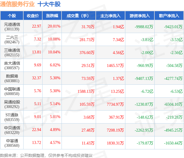 个股表现方面,通信服务行业当日领涨股为元道通信(301139),该股当日报收22.97,上涨20.01%,成交量31.7万,主力资金净流入1.94亿元。二六三(002467)以上涨10.08%紧随其后,该股当日成交量281.73万,主力资金净流入7.34亿元。除此之外,三维通信(002115)、吉大通信(300597)、数据港(603881)均进入当日牛股之列。具体个股列表见下表: