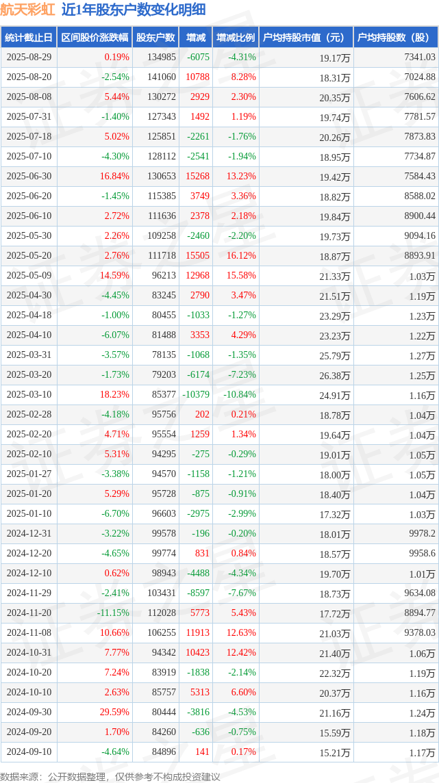 从股价来看,2025年8月20日至2025年8月29日,航天彩虹区间涨幅为0.19%,在此期间股东户数减少6075.0户,减幅为4.31%。