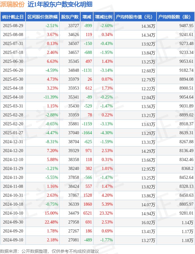 从股价来看,2025年8月8日至2025年8月29日,派瑞股份区间跌幅为2.51%,在此期间股东户数减少899.0户,减幅为2.6%。