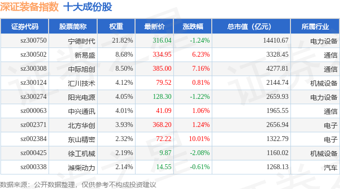 证券之星消息,9月10日,深证装备(399636)指数报收于6825.11点,涨0.93%,成交1931.07亿元,换手率3.21%。当日该指数成份股中,上涨的有31家,东山精密以10.01%的涨幅领涨,下跌的有47家,锦浪科技以4.43%的跌幅领跌。