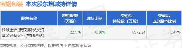 证券之星消息,9月10日宝钢包装发布公告《宝钢包装:关于持股5%以上股东权益变动触及1%刻度的提示性公告》,其股东长峡金石(武汉)股权投资基金合伙企业(有限合伙)于2025年7月10日至2025年9月10日间合计减持227.76万股,占公司目前总股本的0.1785%,变动期间该股股价上涨2.72%,截止9月10日收盘报5.29元。